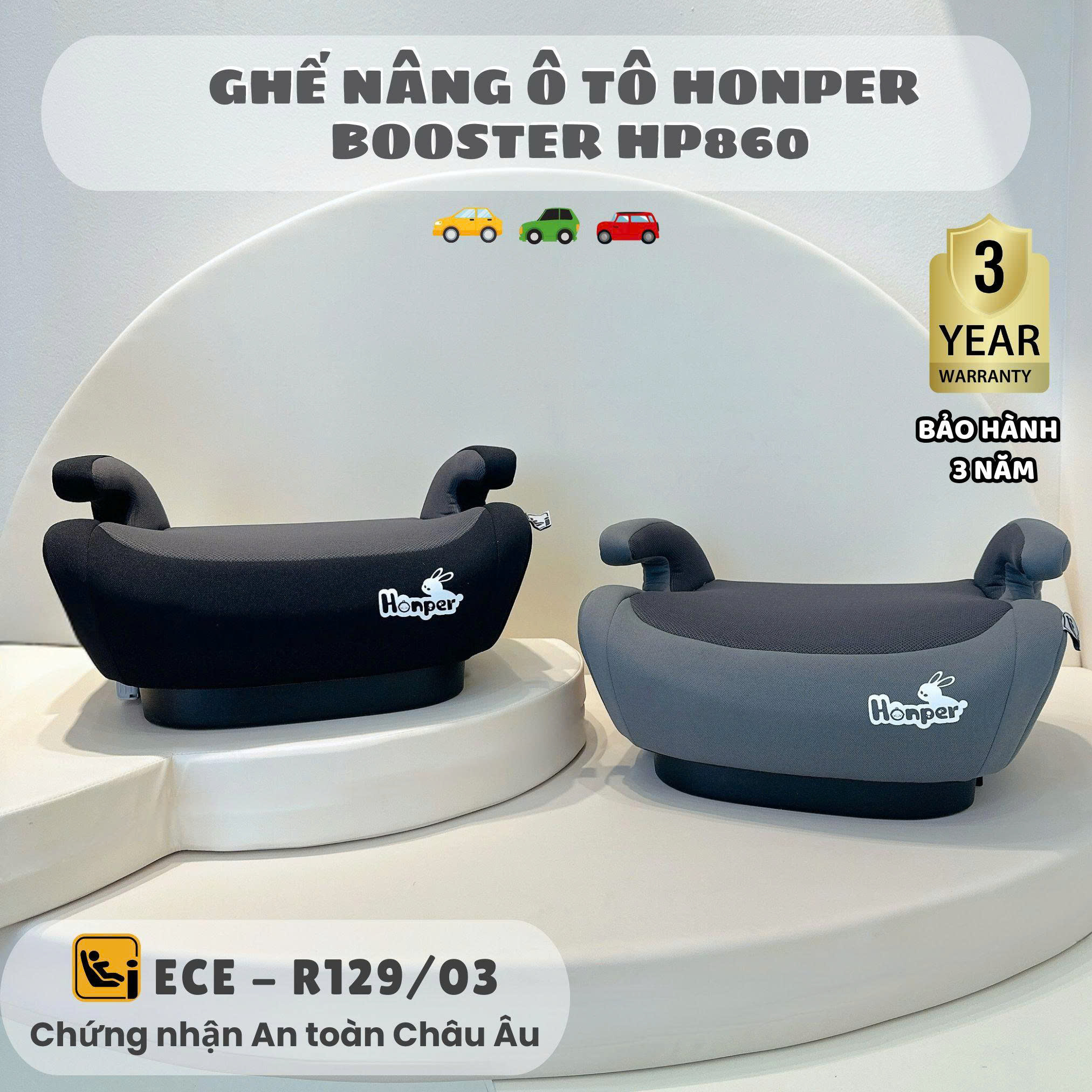- Ví dụ sản phẩm khuyến nghị: Ghế nâng ô tô Honper Booster HP860 – Đạt chuẩn ECE R129/03 (i-Size), trọng lượng chỉ 3kg, kích thước 41.5 × 23 × 40 cm, lắp bằng ISOFIX + dây an toàn xe. Đây là lựa chọn lý tưởng cho bé lớn hơn nhưng chưa đủ chiều cao sử dụng dây an toàn thông thường.